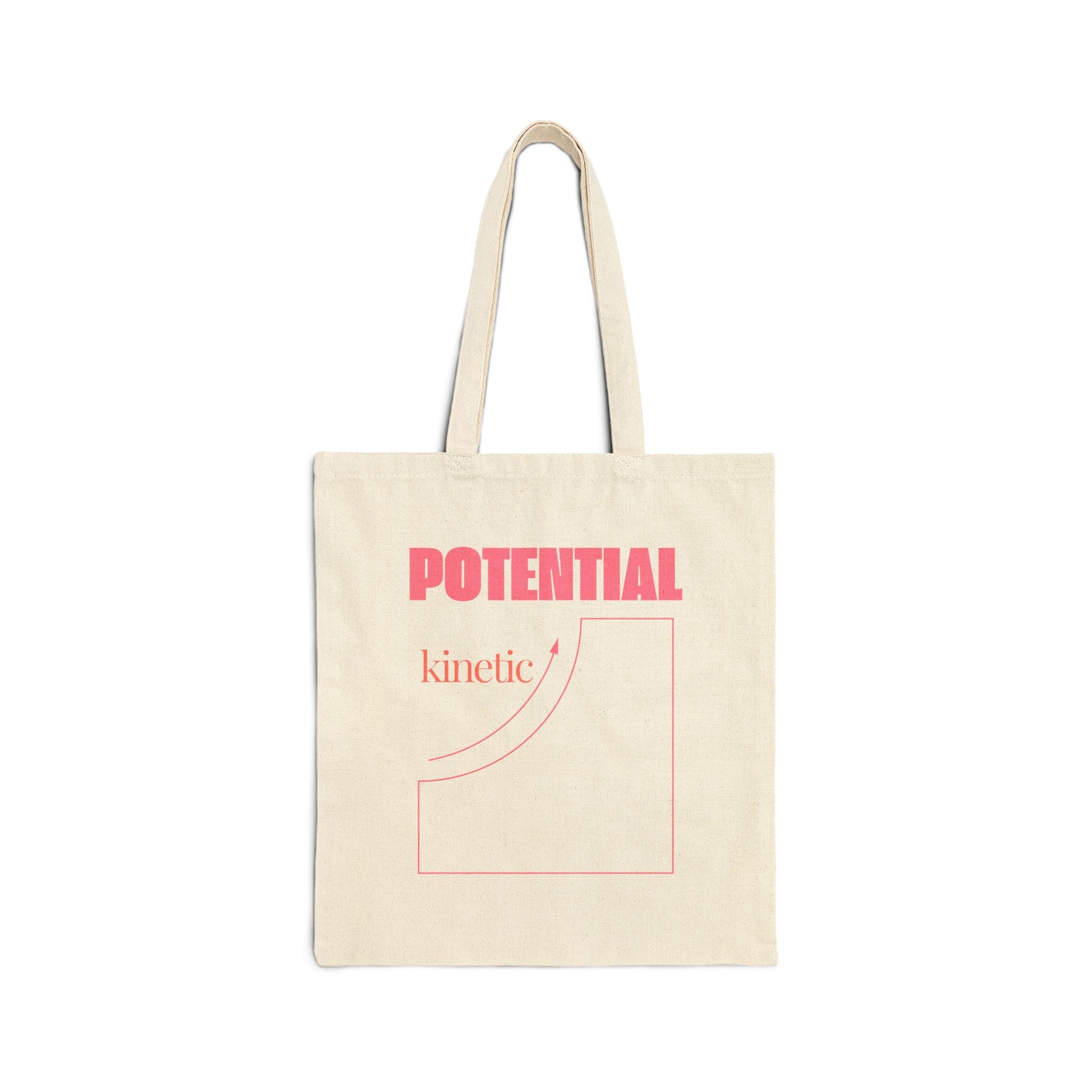 A durable cotton canvas tote bag featuring a physics and engineering pun about energy. Perfect for carrying books, groceries, or daily essentials with a touch of clever humor. Ideal for students, scientists, and anyone with a nerdy sense of humor. Relevant for back to school, graduation, or any occasion where a practical and fun tote bag is needed.